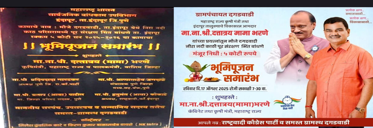इंदापूर, दि. १७ ऑगस्ट २०२५: इंदापूर तालुक्यातील मौजे दगडवाडी येथील श्री नंदिकेश्वर मंदिरात आज ५ कोटी रुपयांच्या विकासकामांचे उद्घाटन मोठ्या थाटामाटात पार पडले. पण हा सोहळा महायुतीतील भारतीय जनता पक्ष (भाजपा) साठी डोळ्यांत तिखट मिरची टाकणारा ठरला. स्थानिक आमदार दत्तात्रय भरणे यांच्या नेतृत्वाखालील राष्ट्रवादी काँग्रेस (अजित पवार गट) ने हा कार्यक्रम एकहाती रेटत भाजपाला निमंत्रणाचा कागदही पाठवला नाही. यामुळे तालुक्यातील राजकीय वातावरण ढवळून निघाले आहे, आणि भाजपाची अवहेलना झाल्याची भावना कार्यकर्त्यांमध्ये पसरली आहे.