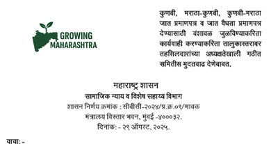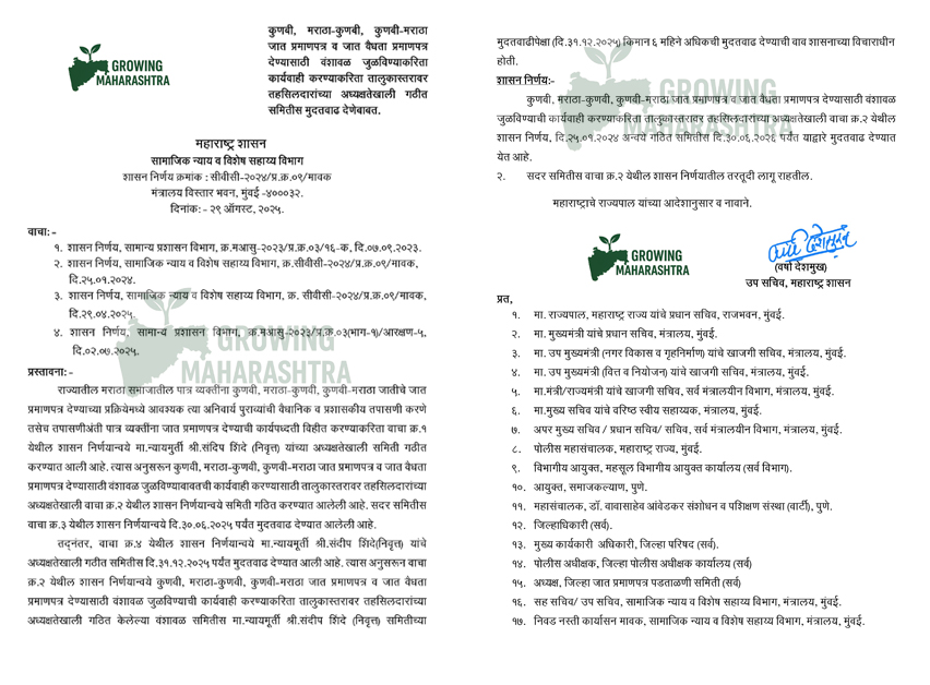 मुंबई, ३० ऑगस्ट २०२५ – राज्य सरकारने मराठा समाजातील पात्र व्यक्तींना कुणबी, मराठा-कुणबी व कुणबी-मराठा जातीचे जात प्रमाणपत्र व जात वैधता प्रमाणपत्र देण्यासाठी तालुकास्तरावर तहसिलदारांच्या अध्यक्षतेखाली गठीत वंशावळ समितीची मुदत ३० जून २०२६ पर्यंत वाढवण्याचा निर्णय घेतला आहे. याबाबतचा शासन निर्णय सामाजिक न्याय व विशेष सहाय्य विभागाने निर्गमित केला असून, सामाजिक न्याय मंत्री संजय शिरसाट यांनी अधिकृतपणे माहिती दिली आहे.