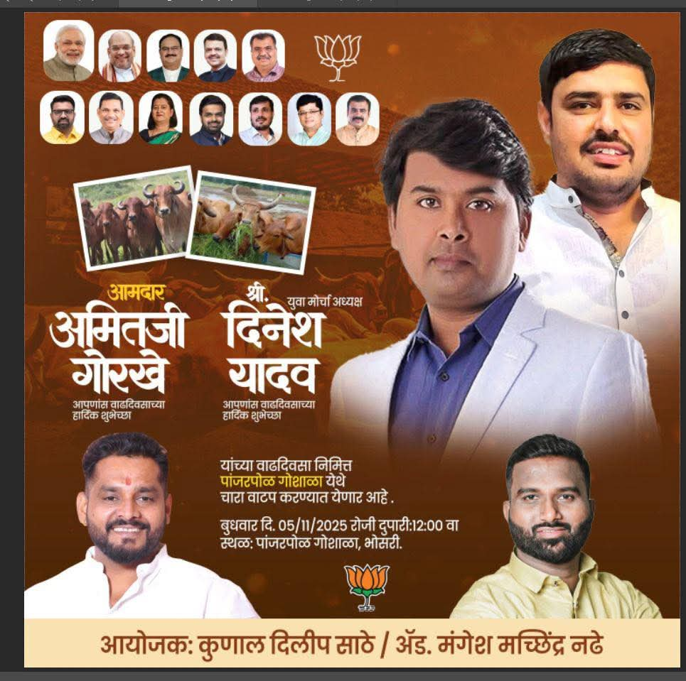 भाजप युवा नेते कुणाल साठे व भाजप युवा मोर्चाचे ॲड. मंगेश नढे यांच्या पुढाकाराने विधानपरिषद आमदार श्री. अमितजी गोरखे व भाजप युवा मोर्चा पिंपरी चिंचवड शहर अध्यक्ष श्री. दिनेश यादव यांच्या वाढदिवसानिमित्त दिनांक ०५ नोव्हेंबर २०२५ (बुधवार) रोजी भोसरी येथील पांजरपोळ गोशाळेत चारा वाटप व निधीदान कार्यक्रम उत्साहात पार पडला.या कार्यक्रमाचे आयोजन भाजपचे युवा नेते कुणाल साठे व भाजप युवा मोर्चाचे ॲड. मंगेश नढे यांनी केले होते.