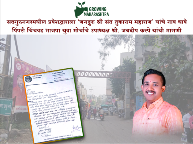 पिंपरी-चिंचवड महानगरपालिकेच्या प्रभाग क्र. ६ मधील सदगुरुनगर परिसरात नुकतेच एक नवीन प्रवेशद्वार उभारण्यात आले आहे. या प्रवेशद्वाराला ‘जगद्गुरु श्री संत तुकाराम महाराज’ यांचे नाव देण्यात यावे, अशी मागणी भारतीय जनता युवा मोर्चाचे शहर उपाध्यक्ष श्री. जयदीप करपे यांनी महानगरपालिका आयुक्तांकडे लेखी निवेदनाद्वारे केली आहे.